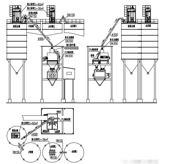 3、所有筒倉的排氣管路都引到地面除塵器里,所以兩倉或三倉共用一個除塵器時不存在串料問題。